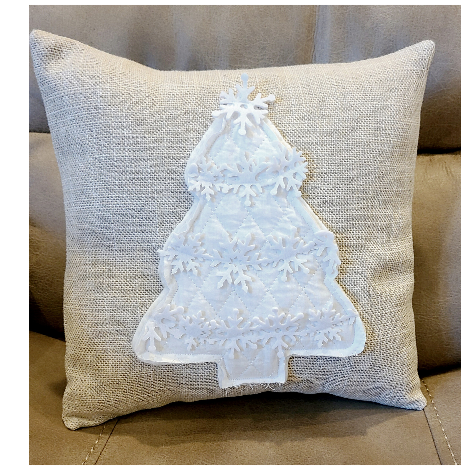 Handmade design by Simply Home. White canvas tree with decorative snowflake garland on home furnishings cream fabric. Pillow cover has an envelope back for insert.