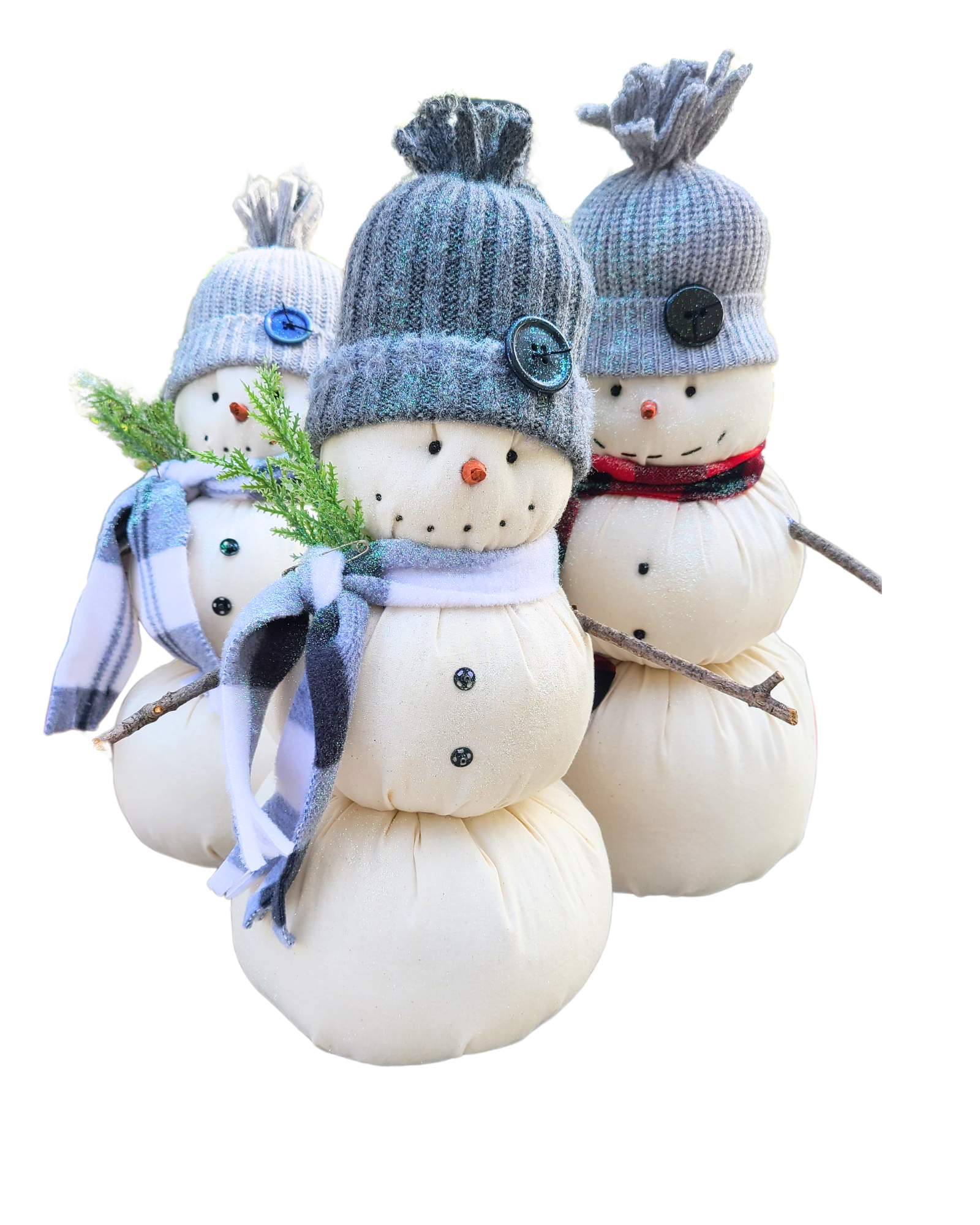 A weighted, fabric snowman with stocking cap and scarf. Frosty stands 15" tall and has real sticks for arms.
